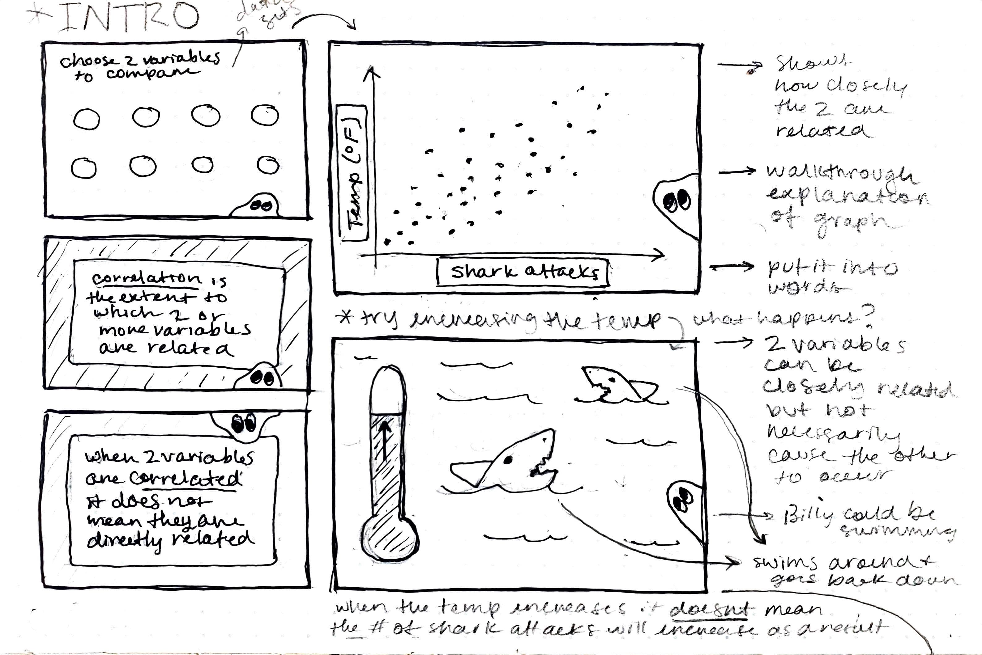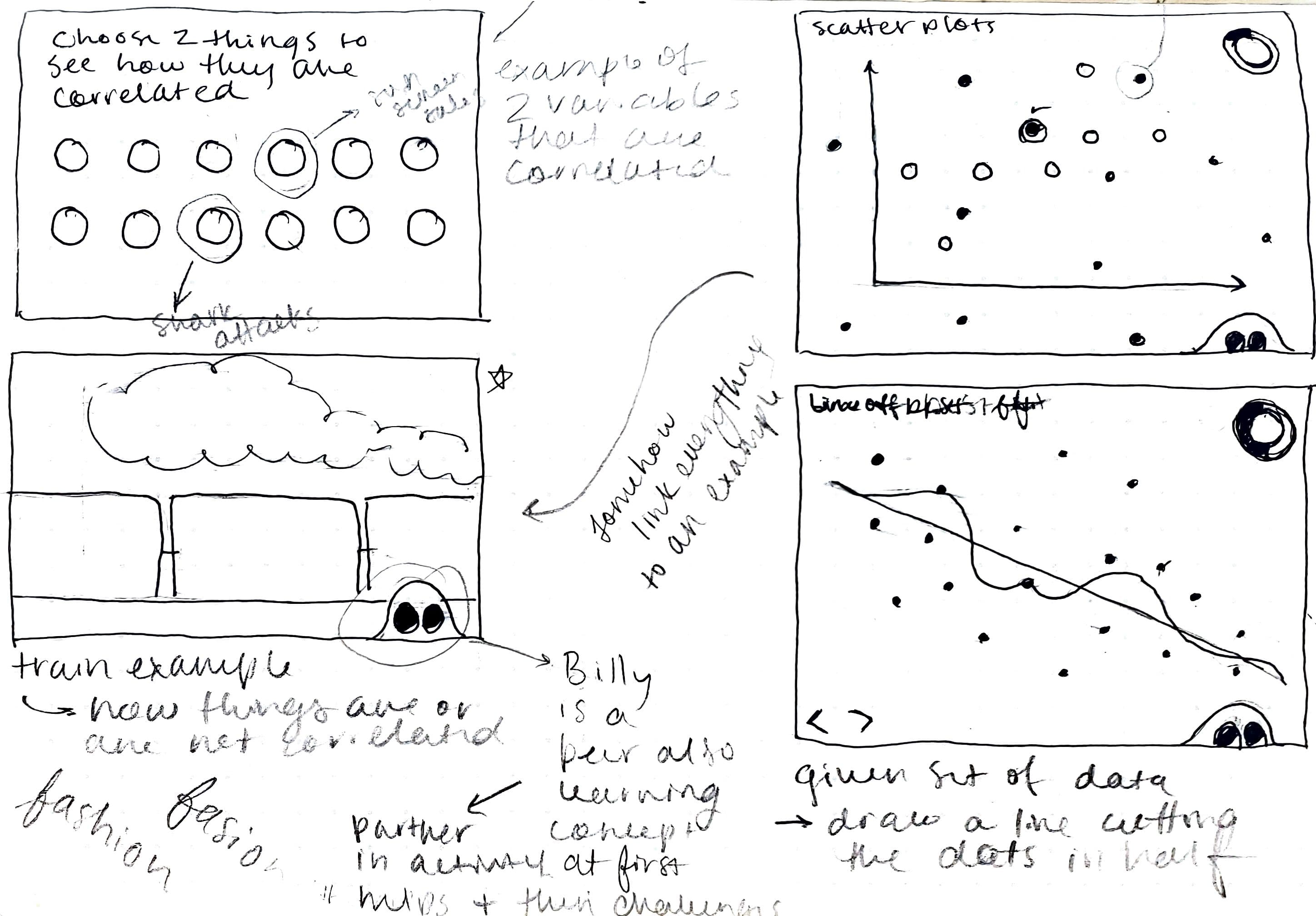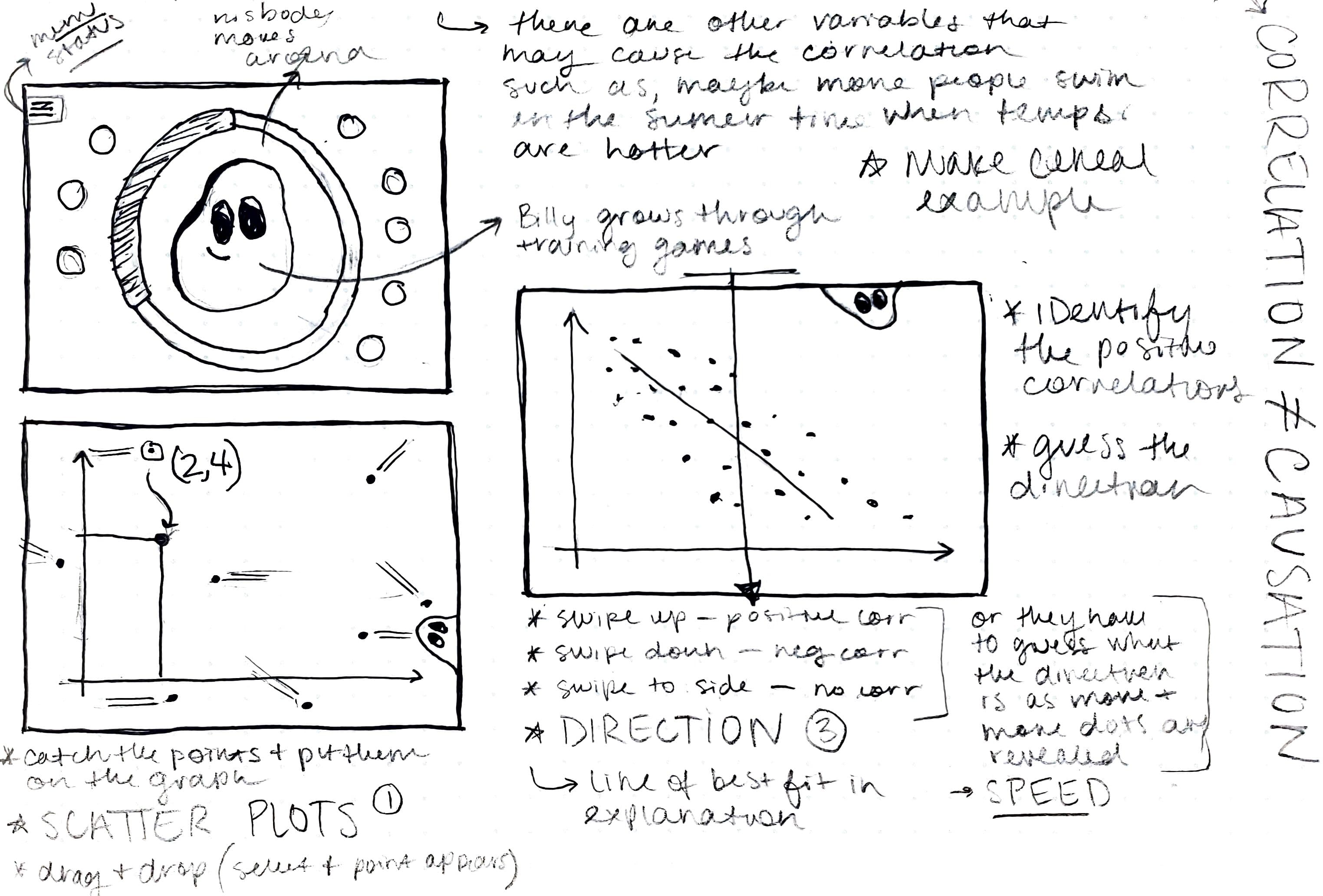 Our goal was to develop a tool that would explain a data concept-correlation-and its relevance to understanding a sample data set, allowing users to realize the importance of data literacy. First, we conducted a number of interviews with middle school students and teachers to better understand our users. We learned middle schoolers enjoy narratives, have short attention spans, and want to know why the concepts they are learning are relevant. We developed a digital learning tool-for a tablet-that would keep kids engaged while they improve their data literacy skills.