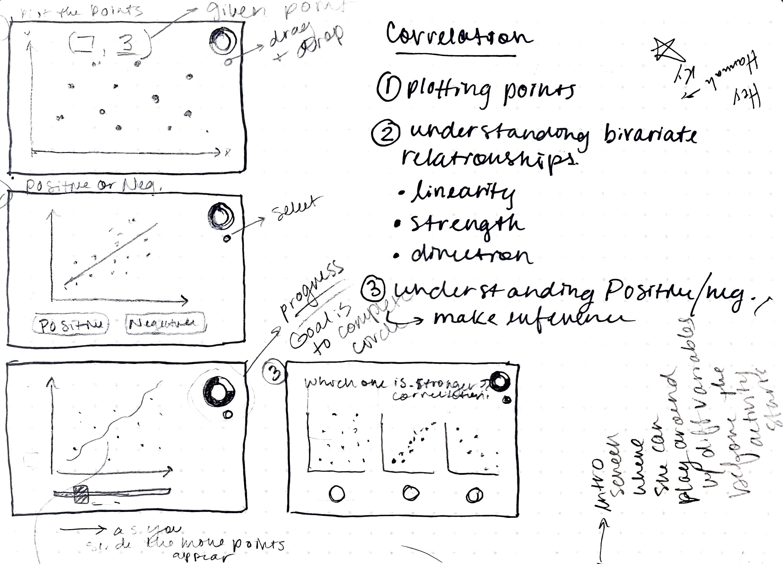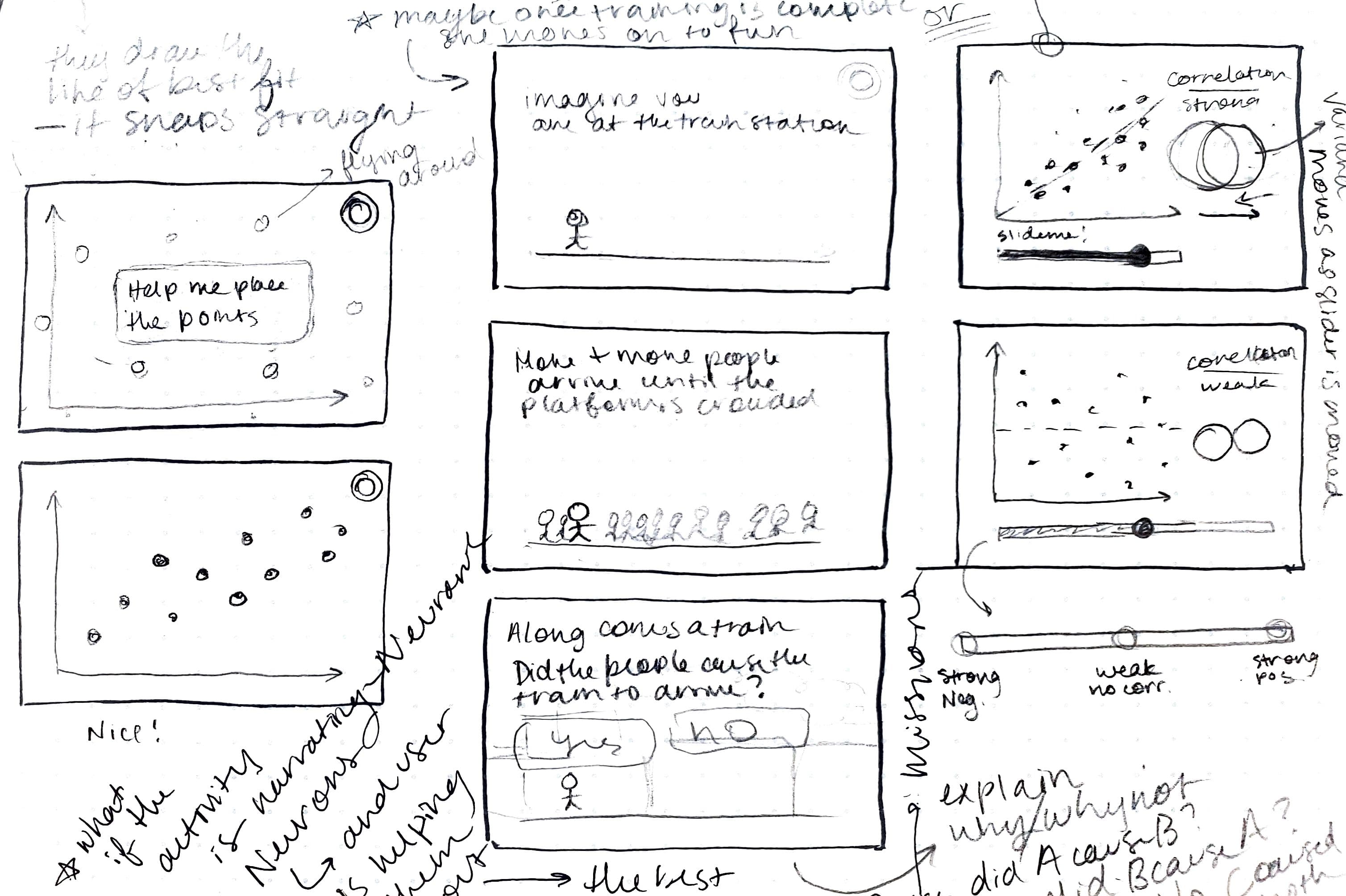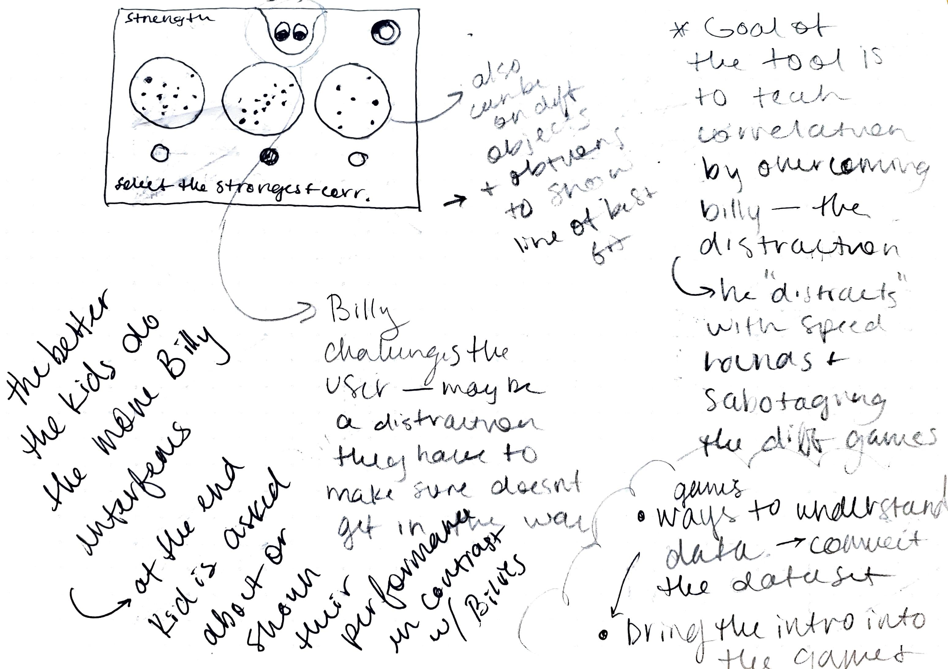 Our goal was to develop a tool that would explain a data concept-correlation-and its relevance to understanding a sample data set, allowing users to realize the importance of data literacy. First, we conducted a number of interviews with middle school students and teachers to better understand our users. We learned middle schoolers enjoy narratives, have short attention spans, and want to know why the concepts they are learning are relevant. We developed a digital learning tool-for a tablet-that would keep kids engaged while they improve their data literacy skills.